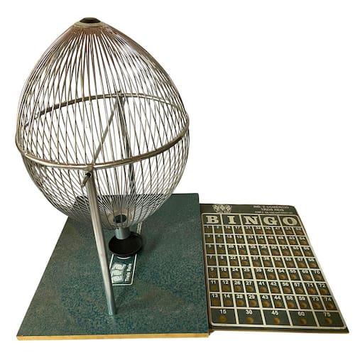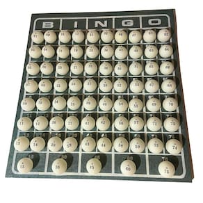 Jogo de bingo completo com globo em metal, tabuleiro em madeira MDF com cavidades numeradas para as bolinhas sorteadas e 75 bolinhas de ping-pong numeradas e com letras. A numeração é feita da seguinte forma:
