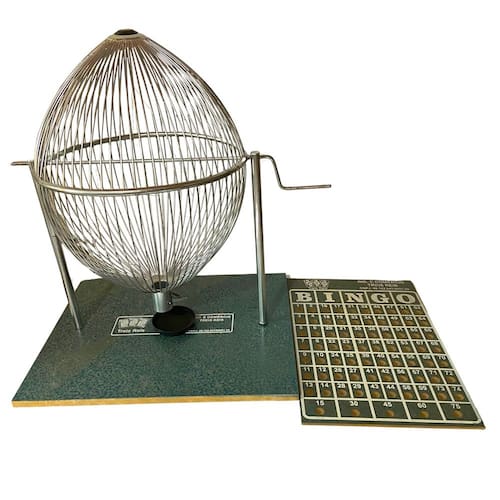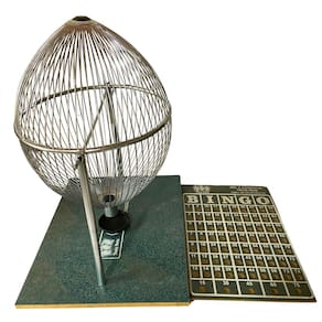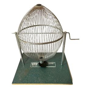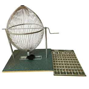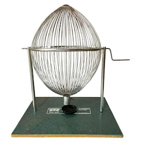 Jogo de bingo completo com globo em metal, tabuleiro em madeira MDF com cavidades numeradas para as bolinhas sorteadas e 75 bolinhas de madeira numeradas e com letras. A numeração é feita da seguinte forma: