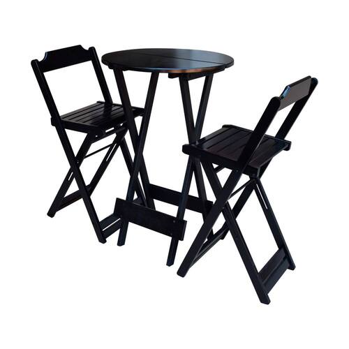 Jogo De Bistrô C/ 02 Banquetas Preto é ideal para bares, restaurantes, estabelecimentos, áreas de lazer e tambem para sua casa. Feito em madeira maciça, tornando resistentes e duráveis. Seu design permite que seja encaixado em qualquer ambiente, trazendo um toque a mais para seu estabelecimento. Além de sua durabilidade, o que lhe trará conforto para servir seus clientes. Por ser dobrável torna-se mais fácil guardar, manusear e limpar o produto. Atenção: EVITE USAR PRODUTOS ABRASIVOS E QUíMICOS PARA LIMPEZA DO PRODUTO, aconselha-se o uso de pano umedecido para melhor conservação; mantenha o produto fora de chuva e sol constantes. OBS: MDF ULTRA MESA Cor: Preto Modelo: Bistrô Dobravel Dimensões: Altura 99cm | Largura 55cm | Profundidade 55cm CADEIRA Cor: Preto Modelo: Bistrô Dobravel Dimensões: Altura 100cm | Largura 38cm | Profundidade 37cm