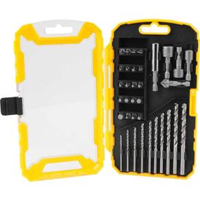 1 Jogo de bits, brocas e soquetes, composto por um estojo plástico com 35 peças, sendo: 10 brocas de aço rápido (2,0 mm, 2,5 mm, 3,0 mm, 3,2 mm, 3,5 mm, 4,0 mm, 4,5 mm, 5,0 mm, 5,5 mm, 6,0 mm), 4 bits fenda S2 comprimento 25,0 mm (3,0 mm, 4,0 mm, 5,0 mm, 6,0 mm), 3 bits phillips S2 comprimento 25,0 mm (PH1, PH2, PH3), 3 bits pozidrive S2 comprimento 25,0 mm (PZ1, PZ2, PZ3), 4 bits hexalobular S2 comprimento 25,0 mm (T15, T20, T25, T30), 3 bits allen S2 comprimento 25,0 mm (4,0 mm, 5,0 mm, 6,0 mm), 3 bits encaixe quadrado S2 comprimento 25,0 mm (S1, S2, S3), 1 suporte magnético para bits, 1 escareador para madeira 12,0 mm e 3 soquetes magnéticos/pontas canhão (6,0 mm, 8,0 mm, 10,0 mm).