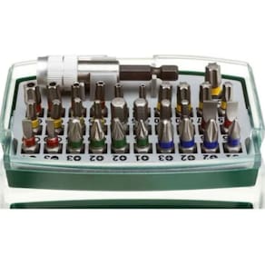 Características: - Kit Promoline colorido com 32 peças. - Acompanha Estojo Plástico emborrachado. - Pontas de qualidade profissional com marcação por cores. Acompanha:- 1 Estojo. - 1 Engate Rápido. - 4 Pontas Philips: 1, 2, 2 E 3. - 4 Pontas Phz: 1, 2, 2 E 3. - 4 Pontas Fenda: 3, 4, 5 E 6. - 4 Pontas Hexagonais: 3, 4, 5 E 6. - 8 Pontas Torx Sem Furo: T10, 15, 20, 20, 25, 27, T30 E T40. - 7 Pontas Torx Com Furo: T10, 15, 20, 25, 27, 30 E T40.