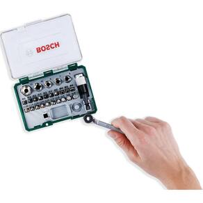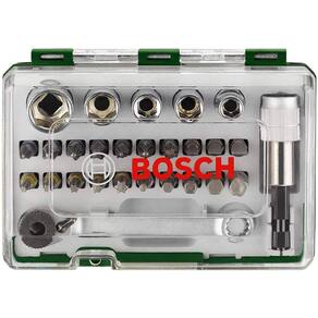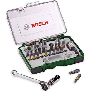 Jogo De Bits E Soquetes com Catraca 27 Peças - BoschOs Kits de Pontas e Soquetes Bosch Extra Hard são ideais para aplicações universais de parafusamento e fixação.As Pontas e Soquetes são fabricados com aço de alta qualidade com processo de tratamento térmico que traz alta resistência e permite um alto desempenho nas aplicações. A zona de torção cônica das pontas absorve a força e vibração durante as aplicações executando todos os parafusamentos com facilidade.O portfólio Bosch Extra Hard é completo e possui Pontas Philips PH , Pozidriv PZ , Torx T , Fenda S e soquetes em diferentes diâmetros com encaixe hexagonal 1/4. São indicados para utilização em furadeiras e parafusadeiras. CONTEÚDO DA EMBALAGEM- 1 Estojo- 19 Bits de 25 mm: Ph 1 / 2 / 2 / 3, Pz 1 / 2 / 3, Fen 4 / 5 / 6, Torx 10 / 15 / 20 / 25 / 30, Hex 3 / 4 / 5 / 6,- 1 Minichave de catraca- 1 Adaptador multi-fit- Soquetes 6 / 7 / 8 / 10 / 13 mm + adaptador Ean: 3165140659208