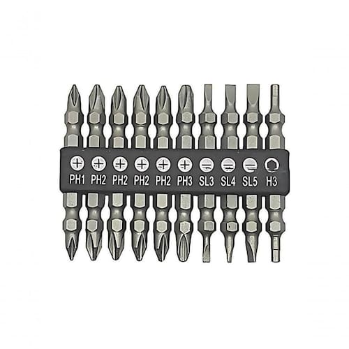 Jogo De Bits Ponta Dupla Western Para Furadeira E Descricao JOGO 10 BITS PONTEIRA 65MM - BIT-165Os Bits da Western sao ideais para apertar e desapertar parafusos de maneira extremamente agil e precisa, de maneira pratica e simples!Caracteristicas:- Apertar e desapertar parafusos.- Para Furadeira e Parafusadeira.Cuidados:Utilize equipamentos de protecao individual (oculos de protecao, luvas etc...) Necessario ao trabalho.- Use a ferramenta correta para sua aplicacao. Nao force a ferramenta. A ferramenta correta fara o trabalho melhor e mais seguro se utilizada para aquilo que foi projetada.- Use o tipo e tamanho correto de ferramenta para cada tipo de trabalho.- Armazene em local limpo e seco e fresco.- Guarde em local seguro.- Guarde estas instrucoes para futuras consultas.- Manter fora do alcance das criancas.*Imagens meramente ilustrativas.Especificacao Tecnica Dimensoes da Peca: 6,5 x 0,7 x 0,7cm (cada)Dimensoes da Embalagem:12 x 1,4 x 14,5cmQuantidade Inner: 25 PecasDimensoes Inner: 25,5 x 19,5 x 13cmQuantidade Master:100 PecasDimensoes Master:40 x 27 x 29cmMaterial: Cromo vanadioCor: CinzaTipo de Embalagem: BlisterMarca:WesternOrigem: ChinaJogo contendo 10 pontas:3 Fendas: 3mm 4mm 5mm;6 Philips: #1 #2 #3 #2 #2 #2;1 Hex: 3mm. Descricao JOGO 10 BITS PONTEIRA 65MM - BIT-165Os Bits da Western sao ideais para apertar e desapertar parafusos de maneira extremamente agil e precisa, de maneira pratica e simples!Caracteristicas:- Apertar e desapertar parafusos.- Para Furadeira e Parafusadeira.Cuidados:Utilize equipamentos de protecao individual (oculos de protecao, luvas etc...) Necessario ao trabalho.- Use a ferramenta correta para sua aplicacao. Nao force a ferramenta. A ferramenta correta fara o trabalho melhor e mais seguro se utilizada para aquilo que foi projetada.- Use o tipo e tamanho correto de ferramenta para cada tipo de trabalho.- Armazene em local limpo e seco e fresco.- Guarde em local seguro.- Guarde estas instrucoes para futuras consultas.- Manter fora do alcance das criancas.*Imagens meramente ilustrativas.Especificacao Tecnica Dimensoes da Peca: 6,5 x 0,7 x 0,7cm (cada)Dimensoes da Embalagem:12 x 1,4 x 14,5cmQuantidade Inner: 25 PecasDimensoes Inner: 25,5 x 19,5 x 13cmQuantidade Master:100 PecasDimensoes Master:40 x 27 x 29cmMaterial: Cromo vanadioCor: CinzaTipo de Embalagem: BlisterMarca:WesternOrigem: ChinaJogo contendo 10 pontas:3 Fendas: 3mm 4mm 5mm;6 Philips: #1 #2 #3 #2 #2 #2;1 Hex: 3mm. Ean: 7896980425925