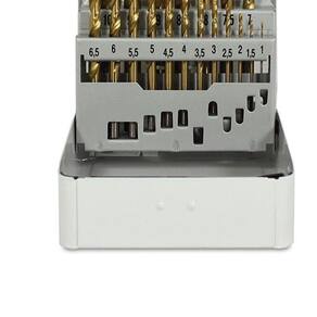 Prático estojo metálico com 25 pçs feitas com cobertura Titanium que garante a qualidade Hessen aumentando a vida útil das brocas.