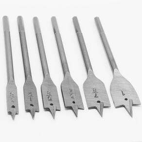 - 6 Brocas Chatas para Madeira, nos tamanhos 3/8", 1/2", 5/8", 3/4", 7/8" e 1" - Broca em aço carbono - Ideal para corte em lâminas/chapas finas de madeira - Comprimento da Broca - 6" - 15 cm