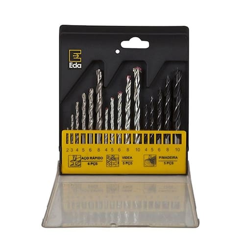 Jogo de brocas com 16 peças em aço carbono, hss e widea 9tg eda - marca: eda - referência: 9tg - kit com 16 brocas - brocas em aço rápido, aço carbono e widea - para metal, concreto e madeira - dimensão: 17x15x2cm - peso bruto: 315g itens inclusos - 6 brocas paralelas em aço rápido: 2,3,4,5,6 e 8mm - 5 brocas com ponta de videa: 4,5,6,8,10mm - 5 brocas para madeira: 4,5,6,8,10mm