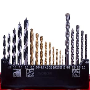 Jogo de Brocas e Bits da Worker conta com 38 peças feitas em aço resistente, oferecendo maior durabilidade. As peças são acondicionadas em uma maleta plástica com visor transparente e compartimento para cada item, permitindo organização e praticidade. Indicado para operações diversas com metal, madeira e concreto. Ideal para utilização em furadeiras e parafusadeiras de qualquer marca.