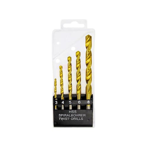 Jogo De Brocas P/ Metal Com 5 pçs 723869 MtxCARACTERÍSTICAS:-Kit de Brocas Aço Metal 3-4-5-6-8mm- Feitas de aço de corte rápido- Revestimento de nitreto de titanio- Superfície da broca tem dureza aumentada- Coeficiente de fricção reduzido, que melhora consideravelmente carateristicas da ferramenta (revestimento de nitreto de titanio aumenta adurabilidade da ferramenta 2 - 2,5 vezes).- Haste sextavada prevem giracao desnecessaria num mandril.- Jogo contém brocas para metal de tamanhos mais populares.- Jogo e colocado numa caixa de polipropileno.ESPECIFICAÇÕES:- Dimensões 21 x 11 x 2cm- Revestimento Nitreto de Titânio (tiN)- Brocas 1,5 a 6,5mm- Material Aço Rápido- Peso 420gIMAGENS MERAMENTE ILUSTRATIVAS