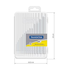 15 brocas de tamanhos variados: 1.0, 1.5, 2, 2.5, 3, 3.5, 4, 4.5, 5, 5.5, 6, 7, 8, 9, 10 mm.