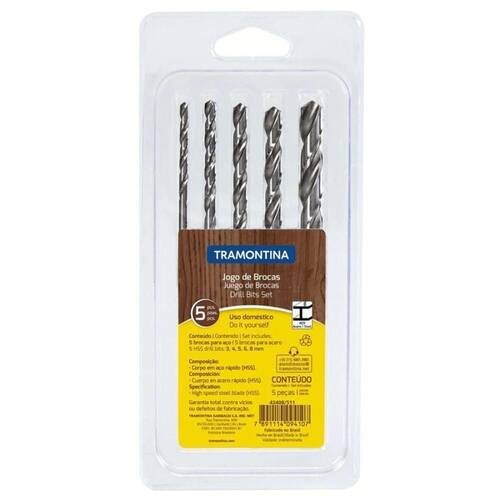 Jogo De Brocas Para Aço Tramontina 5 Peças O Jogo de Brocas para Aço Tramontina 5 Peças é o conjunto ideal para perfurar aço. Com a qualidade das brocas Tramontina, as cinco peças apresentam tamanho de 3, 4, 5, 6 e 8 mm. Além disso, são produzidas com a resistência e durabilidade do aço rápido HSS. São as ferramentas certas para as exigências de diferentes tipos de trabalho. Ean: 7891114152401