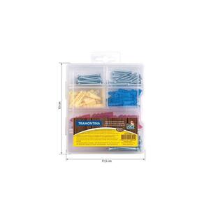 Conteúdo: 20 parafusos 3,5x25mm; 15 parafusos 4x30mm; 15 parafusos 5x38mm; 20 buchas azuis 5mm; 15 buchas amarelas 6mm; 15 buchas vermelhas 8mm.