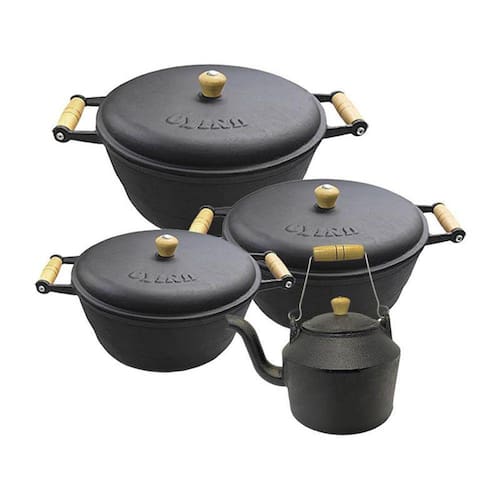 Jogo de Caçarola Ferro Chaleira Panela Com Alça Madeira Nº 6 Panelas: Ideal para Arroz, frango, feijão e etc. A panela de ferro Casa e Jardim apresenta uma grande versatilidade onde elas fornecem suplementação de ferro para o organismo, não liberam toxinas nos alimentos. Tendo uma resistência duradoura cozinhando os alimentos por muito tempo. Todas as panelas de ferro do modelo caçarola podem ser utilizadas em todos os tipos de fogão a gás, a lenha, elétrico e também em cooktop de indução. Chaleira: Chaleira de Ferro Fundido Casa E Jardim com alça de madeira com batoque de madeira e tampa de Ferro, com capacidade de 2 Litros. Ideal para preparar seu chá da tarde ou seu café, indicado para rede de hotelaria e cozinhas industriais, bem como restaurantes e linha gourmet. Descrição do Jogo:ChaleiraMedida da Boca: 15cm Litros: 2 Litros Medidas Externas: 15cm x 25cm x 15cm Panela 1 Medida da Boca: 16cm Altura: 8,0cm Litros: 1,2 litros Panela 2 Medida da Boca: 18cm Altura: 9,0cm Litros: 1,6 litros Panela 3 Medida da Boca: 22cm Altura: 9,5cm Litros: 2,6 litros Material: Ferro Fundido.Garantia: 90 dias contra defeito de fabricação.Acompanha: Tampa de ferro. Nós da Casa E jardim Comércio trabalhamos com produtos de alta qualidade em ferro fundido, Como Fornos de ferro, panelas de ferro mineira, chapas de fogão a lenha, frigideira de ferro Casa e Jardim, chapa bifeteira de ferro, Fogareiro Ferro Fundido A Alcool Rechaud, calderão de ferro, calderão de bruxa, Rechaud de ferro, Chapa de ferro Casa e Jardim para porções, panelas de ferro, churrasqueiras a bafo toda linha doméstica para lhe atender.