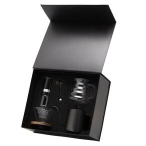 Para quem ama o ritual de preparar um café, apresentamos um conjunto Gourmet feito para te acompanhar em cada etapa do preparo dessa bebida tão especial. Desde o moer dos grãos de café até o servir em uma jarra em vidro borosilicato, extremamente resistente à altas temperaturas. Além desses dois itens, completam o conjunto suporte para filtro Hario em vidro e chaleira de aço inox com bico de ganso para adicionar a água ao filtro com precisão. O conjunto acompanha embalagem especial em box preto com apoio para cada peça. Perfeito para presentear os “Coffee Lovers”.