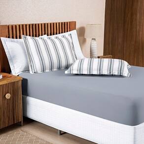 Jogo De Cama 100% Algodão Marin Casal Padrão 03 Peças - Cinza O Jogo de Cama Marin é uma escolha perfeita para quem busca conforto e qualidade. Feito com tecido de malha 100% ALGODÃO, fio 30/1 penteado, ele é resistente e não forma bolinhas com o tempo. As fronhas apresentam estampas em listras encantadoras, enquanto o lençol de baixo é liso e possui elástico em toda a volta, garantindo um ajuste perfeito ao colchão. Com o Jogo de Cama Marin, seu quarto terá um visual aconchegante e cheio de charme. O que vai na embalagem: