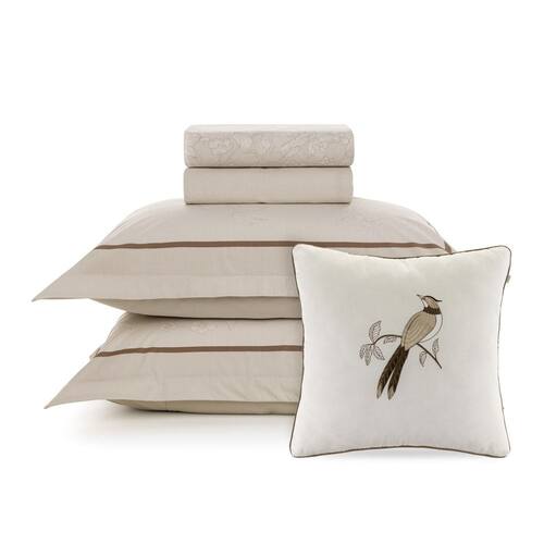 Composta por tons suaves em bege, marfim e detalhes em marrom, a estampa floral se espalha sutilmente pelas superfícies, criando uma atmosfera serena e acolhedora no quarto. A beleza desse jogo está nos contrastes sutis: a leveza do floral no sobre lençol, a sobriedade do fundo liso nas fronhas e o destaque central da almofada com bordado de pássaro, que adiciona um toque artístico e poético à composição. Cada peça carrega um cuidado especial nos acabamentos, o sobre lençol vem com dobra feita, o lençol com elástico, também estampado, é ideal para colchões de até aproximadamente 40cm de altura, as fronhas dimensionadas possuem 4 abas de 4cm, com estampa floral discreta contém um toque refinado sem exageros. Já a capa de almofada é o grande destaque visual: feita em tecido liso, ela traz um bordado localizado de pássaro com aplicação de cordonê nos quatro lados, funcionando como peça decorativa central, perfeita para compor a cama posta com charme e personalidade!