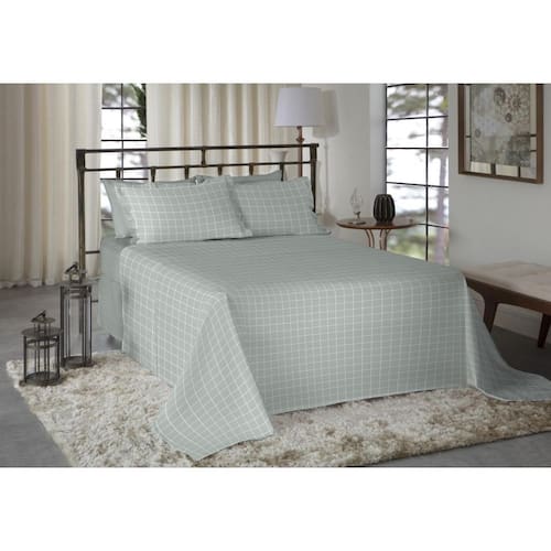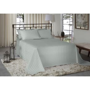 1 lençol, de 2,20 m x 2,47 m com dobra feita; 1 lençol com elástico, de 1,40 m x 1,90 m x 30 cm; 2 fronhas, de 50 cm x 70 cm com abas.