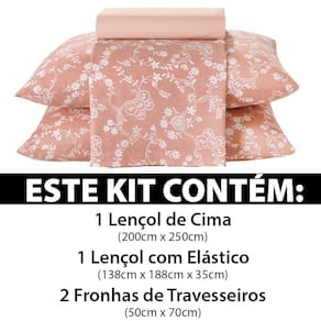 Este kit contém: - 1 Lençol de cima (200x250cm) - 1 Lençol com Elástico (138x188x35cm) - 2 Fronhas de Travesseiros (50x70cm)
