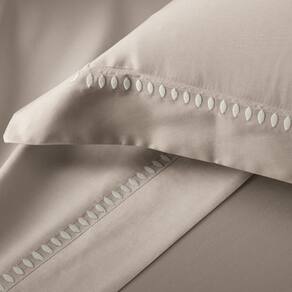 O lençol superior traz o mesmo bordado em posição de destaque na vira, transformando o gesto de arrumar a cama em um momento de cuidado e estilo. O lençol com elástico completa o conjunto com praticidade e conforto.