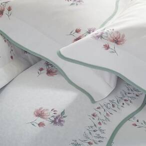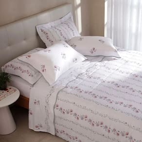 Com moderna e deliciosa composição em finos fios sedosos, a Coleção Donna possui a leveza e o frescor do campo. A vira do sobrelençol e as fronhas trazem refinado padrão floral aquarelado em tons de rosa, lilás e verde, complementados por elegante acabamento contrastante em viés scalloped. Em Gran Percalle 200 fios de puro algodão com fibras longas, possui trama diferenciada, com toque delicado, alta durabilidade e fácil manutenção. Sua maciez é extraordinária, promovendo o conforto em seu ápice para os melhores momentos de descanso.