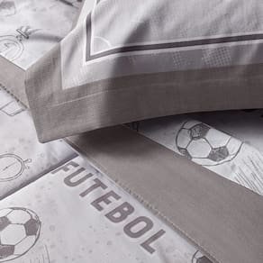 O lençol com elástico neutro na cor cinza, proporciona um contraste elegante e versátil. O sobre lençol é adornado com uma estampa dinâmica que inclui luvas de goleiros, bolas de futebol, chuteiras e troféus, capturando a essência do campeonato e inspirando sonhos de vitória. A fronha, com quatro abas de 4 cm, exibe uma bola em campo, completando o conjunto com um toque de autenticidade esportiva.
