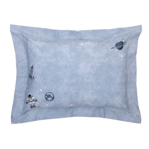 O Jogo de Cama Infantil Casal Kacyumara Vida Bela Apollo traz um universo de aventuras ao quarto com sua temática espacial encantadora. A estampa, com astronautas, naves, planetas e constelações, em um tom de azul acinzentado, cria um ambiente lúdico e acolhedor, perfeito para estimular a imaginação.