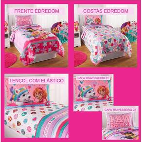 1 edredom dupla face infantil de 260cm largura por 260cm comprimento - Frente estampa Patrulha Canina Skye em grande dimensão - Costas estampa Patrulha Canina Skye em estilo rapport personagens. 1 lençol com elástico para colchão casal queen de até 40cm de altura - Estampa Patrulha Canina Skye em estilo rapport personagens. 2 fronhas estampadas de 70cmx50cm - Frente e costas estampa Skye Patrulha Canina