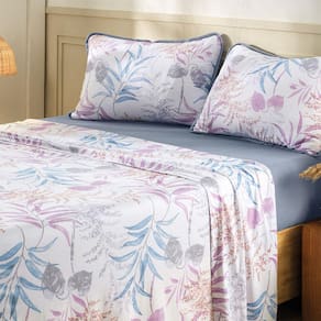 Cada peça deste jogo de cama foi cuidadosamente confeccionada com algodão de fio penteado, garantindo uma experiência de toque suave e delicado. Sinta o aconchego deste material luxuoso enquanto você se prepara para uma noite de descanso reparador. O design Fresh Tropical traz para o seu espaço cores suaves e os padrões vibrantes das paisagens tropicais. Essas peças adicionam um toque de sofisticação à decoração do seu quarto, transformando-o em um ambiente acolhedor e convidativo. O conjunto inclui tudo o que você precisa para um visual completo: lençol superior, lençol com elástico e duas fronhas. A malha de alta qualidade garante respirabilidade, mantendo você fresco durante as noites quentes e proporcionando calor adicional quando necessário.