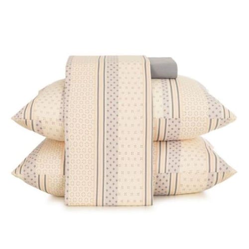 A leveza da malha em puro algodão com fio penteado, que confere ainda mais maciez e durabilidade ao jogo de cama e a estampa com desenhos geométricos, criam uma composição moderna e aconchegante para a cama.