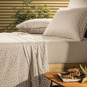 A estampa Bits Mocha traz o charme atemporal do poá em uma versão delicada e moderna, perfeita para quem busca um toque de leveza na decoração do quarto. Produzida em puro algodão, garante alta maciez e conforto em todas as peças. Disponível em edredom com enchimento em poliéster thermobonder de 150g/m, colcha matelassada com viés e porta-travesseiro, além de jogos de cama completos ou simples, ela se adapta a diferentes estilos e necessidades. Os lençóis possuem elástico de 40cm, que se ajusta facilmente a colchões queen e king, oferecendo praticidade no dia a dia. O poá se coordena harmoniosamente com as cores lisas da linha, permitindo composições versáteis e sofisticadas para transformar sua cama em um refúgio de aconchego e estilo.