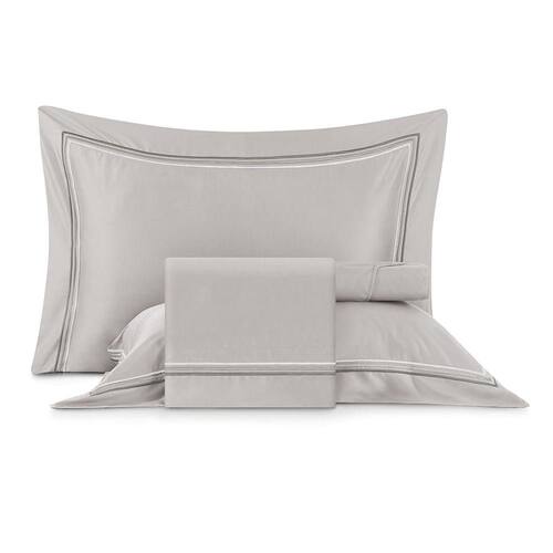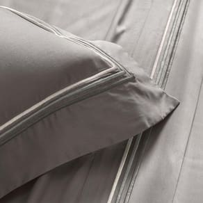 O conjunto é composto por 2 Fronhas (50cm x 70cm) com acabamento em festonê triplo nas três abas de 9cm, Lençol superior com dobra feita e aplicação de festonê triplo em U e Lençol com elástico, garantindo um ajuste perfeito ao colchão. Disponível em duas cores elegantes: branco, com sobreposição de tons, e cinza, com faixas em degradê.