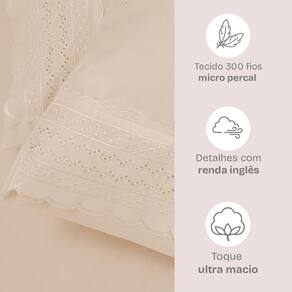 O sobre lençol de fios penteados adiciona um toque de sofisticação à sua cama, enquanto a fronha para travesseiro com renda que completam o conjunto, proporcionando conforto para o seu travesseiro, garantindo uma excelente experiência para seu descanso.