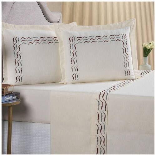 Feito com tecido 100% algodão, este jogo de cama proporciona uma experiência de sono indulgente, abraçando-o com sua suavidade e frescor. Mas não é só isso! Os detalhes fazem toda a diferença, e é por isso que o Jogo de Cama Lençol Sorrento é adornado com bordados meticulosamente elaborados em linha de seda.