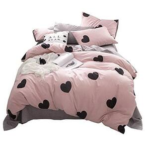 1 edredom dupla face com enchimento 240x240cm - Frente cor rosé com estampa corações preto - Costas cinza claro no mesmo tom do lençol.