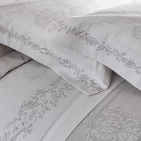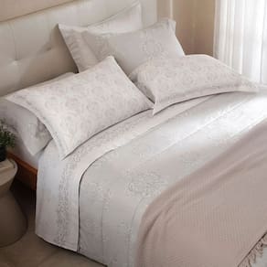 A estamparia com arabescos em tons de cinza e moldura em mini arranjos florais destacam-se no sobre lençol e fronhas com elegância e refinamento. A base do lençol vem em padrão xadrez conferindo harmonioso complemento. Em puro algodão com fibras longas, o modelo possui a suavidade e maciez incrível do toque acetinado. Muito confortável, resistente e fácil de manter.
