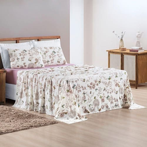 Contém um lençol de baixo com elástico, um lençol de cima e duas fronhas.