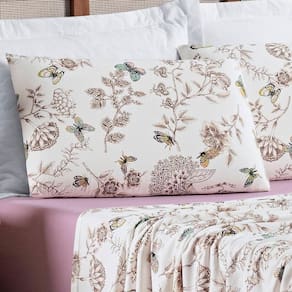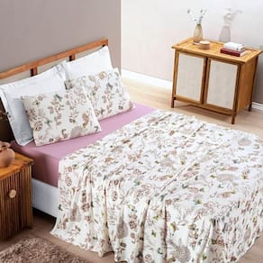 Contém um lençol de baixo com elástico, um lençol de cima e duas fronhas.