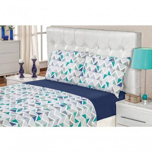 Jogo De Cama Malha Queen Quality 04 Peças - Geométrico Azul - Única
