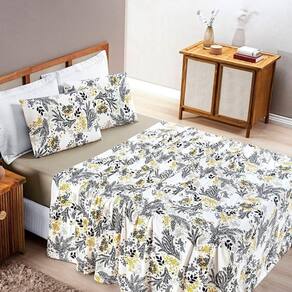 Contém um lençol de baixo com elástico, um lençol de cima e uma fronha.