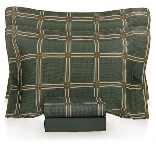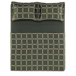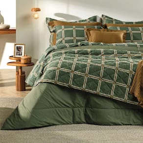 De toque supremo com experiência sensorial do cetim 300 fios, confeccionado em 100% algodão egípcio de fibras longas. Esse tecido sedoso, de toque extremamente macio e com cintilância natural, por conta do entrelaçamento dos fios; além disso, sua estrutura maleável proporciona um caimento perfeito na cama. O algodão egípcio tem propriedades hipoalergênicas e altamente respiráveis, que regulam a temperatura corporal e proporcionam uma noite de sono perfeita. Suas fibras longas impedem a formação de bolinhas e garantem fios mais finos, criando um tecido muito mais suave e confortável. Bernardo se destaca pela estampa contemporânea de presença marcante. Com um desenho geométrico formado pelo encontro de listras, com predominância da cor verde com detalhes em tom bronze. Com sobre lençol estampado com dobra feita e bainha de 3cm, lençol com elástico estampado e fronhas estampada com 3 abas de 7cm, verso tinto e cordonê bronze aplicado. Com caimento perfeito do cetim, Bernardo une a naturalidade do desenho feito à mão à sofisticação de um design único. Foto meramente ilustrativa.
