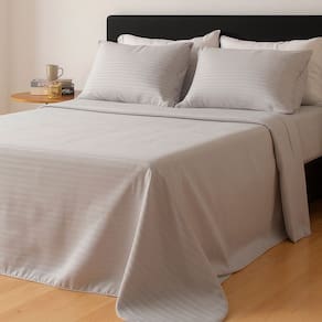 Desenvolvido em Micropercal, este jogo possui uma textura suave e sedosa. Esse lençol proporciona uma sensação agradável ao toque e é ideal para todas as estações, pois mantém o frescor sem reter muito calor durante o verão. O visual minimalista com listras horizontais adiciona charme e um toque de elegância.