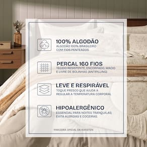 Diferenciais do produto Conforto: maciez do algodão com Toque Soft, que envolve o corpo com suavidade e frescor noite após noite, perfeito para um sono tranquilo em qualquer estação do ano. Elegância: acabamento e caimento impecável com bordados sutis, estampas delicadas e elástico em toda a volta, criando um visual sofisticado e acolhedor para o quarto. Padrão Karsten de qualidade: o algodão, além de hipoalergênico, é penteado: um processo especial que garante mais resistência, antipilling (não forma bolinhas) e respirabilidade, para um toque mais suave e fresco.