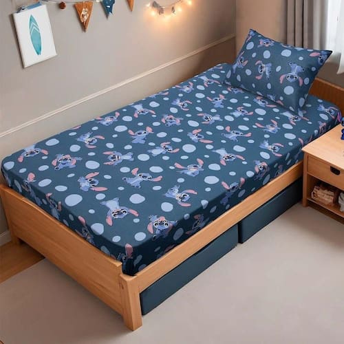 Com o querido personagem Stitch, da Disney, estampado na fronha e no lençol, este conjunto de cama vai encantar os pequenos fãs do desenho. A estampa divertida e colorida transforma o ambiente, criando um espaço lúdico e acolhedor. As cores vibrantes e a imagem carinhosa de Stitch fazem desse jogo de cama uma peça chave na decoração do quarto infantil, criando um ambiente alegre e cheio de personalidade.