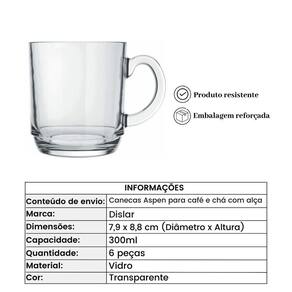 Esse belíssimo Jogo de canecas em vidro 6 pçs 300ml com alça Aspen Incolor, vai super bem com qualquer tipo de decoração graças ao seu aspecto clássico, que combina com tudo, vai ser perfeito para usar no dia a dia ou quando for receber as visitas em casa para tomar um cafézinho ou sua bebida quente favorita deliciosa.Fabricado em vidro de qualidade esse jogo apresenta uma excelente resistência e durabilidade.Itens Inclusos;6 canecas de vidro para café e chá com alça 300ml Aspen IncolorInformações Importantes;Medidas aproximadas - 7,9 x 8,8cm Diâmetro x Altura Capacidade - 300mlComposição - VidroCor - TransparenteValidade - IndeterminadaConteúdo de envio - 1 unidade do Jogo de canecas em vidro 6 pçs 300ml com alça Aspen IncolorFabricante - Nadir FigueiredoProduto 100% nacionalMais Informações;Não vai ao forno.Evite pancadas ou impactos pois podem trincar, lascar ou danificar o produto.Pode ser lavado em lava louças.Ao lavar use de preferência detergente neutro, esponja macia e enxague com água em abundância. Jogo de canecas em vidro 6 pçs 300ml com alça Aspen Incolor