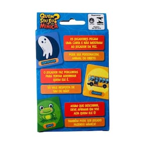 Quem sou eu + mímica' é um conjunto de dois jogos em um, com 150 cartas para 2-10 jogadores. Este jogo promove o raciocínio lógico, interação e conhecimento, além de ser uma diversão garantida para toda a família.