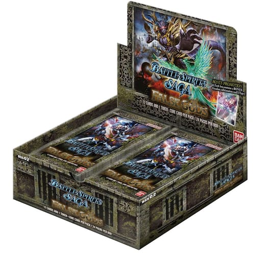 Battle Spirits Saga: False Gods Booster Box (24 ct) - Os jogadores podem construir um forte arquétipo de deck verde! As estrelas deste conjunto são Preybirds e Bladebeasts, magníficos espíritos animais! Eles lutam contra os Voidlords de cada cor que invadem o território vermelho. Este arquétipo de deck é baseado em efeitos que aumentam os núcleos, aumentando o prazer do jogador para o próximo nível! Você pode construir um baralho verde usando apenas cartas deste conjunto, um ótimo produto para novos jogadores! - Inclui espíritos poderosos que podem invocar cartas simbólicas! Cada pacote inclui uma carta! Use fichas para aumentar seus símbolos no tabuleiro. A interação do token com nexos e magia dá um nível ainda mais alto de estratégia ao jogo! - Inclui 7 cartas raras de colaboração de um IP japonês mundialmente famoso! As cartas raras de colaboração apresentam um IP japonês mundialmente famoso! O conjunto incluirá 7 tipos de cartas alternativas fantasticamente projetadas! 1 dos 7 tipos é exclusivo para o topo de caixa holo, e os 6 tipos restantes são holográficos com textura encontrada em pacotes booster! Raridade: ? 278 tipos comuns no total (normal/holover.) × 68 incomuns (normal/holover.) × 32 raros (normal/holover.) × 24 x Raros × 12 Raros Especiais × 11 Raros de Colaboração × 6 + CR Box Topper × 1 Saga Rara × 1Configuração: × 1 Pacote = × 12 cartões × 1 Display = × 24 pacotes × 1 capa = × 12 monitores - Os jogadores podem construir um forte arquétipo de deck verde! - Inclui espíritos poderosos que podem convocar cartões simbólicos! - 24 pacotes por caixa de reforço (12 cartas por pacote). - Tema: Anime - Componentes incluídos: Booster Pack - Dimensões do item: 7 cm