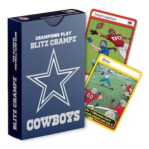 O jogo BLITZ CHAMPZ DALLAS COWBOYS é um divertido jogo de cartas de futebol para crianças a partir de 7 anos! O Blitz Champz pode ser jogado por 2 a 6 pessoas ao mesmo tempo, tornando-o o jogo perfeito para crianças e famílias. Adicione mais diversão à noite de jogos da NFL e da faculdade, tailgating, e festas do Super Bowl com Blitz Champz! - Feito nos EUA. - Jogo de cartas oficialmente licenciado pela NFL. - Pode ser jogado por 2 a 6 pessoas por vez. Jogo perfeito para crianças, famílias, festas na porta traseira e muito mais! - Inclui instruções de jogo e 100 cartas vibrantemente ilustradas com jogadores de futebol masculino e feminino e bandeira. - Selecionado como vencedor do National Parenting Product Awards por ser divertido e reforçar as habilidades matemáticas para crianças do 3º ao 8º ano.