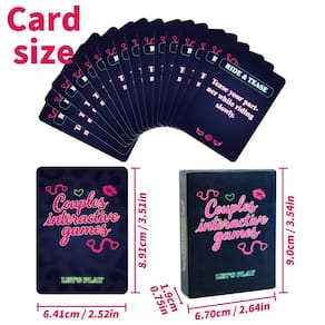Material: papel Cor: preto Tamanho do pacote: 9 × 6,7 × 1,9 cm Peso do pacote: 0,08 kg Lista de embalagem: 1 x conjunto de jogos de cartas para casais (50 cartas) Jogo de cartas para casais românticos — Este jogo de cartas íntimo inclui 50 desafios lúdicos e românticos projetados para ajudar casais a se conectarem emocionalmente e adicionar emoção às noites de namoro. Perfeito para encontros noturnos — Ideal para casais que buscam fortalecer a intimidade, iniciar uma conversa e criar momentos memoráveis juntos em um ambiente descontraído e divertido. Desafios românticos criativos — Cada cartão inclui atividades exclusivas que incentivam o afeto, a comunicação e a interação lúdica entre os parceiros. Ótimo presente para casais — Uma ideia de presente atenciosa para aniversários, Dia dos Namorados, casamentos ou ocasiões especiais que celebram o amor e a conexão. Design compacto e portátil — O baralho de cartas leve com uma caixa protetora facilita o transporte para viagens, férias ou noites românticas em casa.