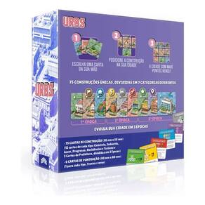 URBS é um jogo rápido e estratégico de ?draft? (pegar e passar cartas), em que os jogadores desenvolvem suas cidades ao longo de 3 Épocas(fases).