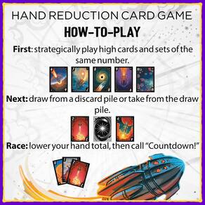 Inicie sua noite de jogo com contagem regressiva 3-2-1! Descarte singles ou conjuntos no seu turno e termine desenhando. Crie estratégias de descartes e empates para ganhar pontos segurando o menor valor de mão! Descarte e desenhe mecânicos fáceis de aprender para todas as idades. Arte envolvente cria um mundo de viagens espaciais retrô. Aprenda com o livro de regras ou o vídeo de como reproduzir em nosso site. Como jogar na sua vez, declare "Contagem regressiva" se achar que tem o menor valor de mão. -OU- Descarte cartas ou conjuntos únicos da sua mão para diminuir o valor da sua mão. - ENTÃO - Desenhe cegamente ou das pilhas de descarte para terminar o seu turno.