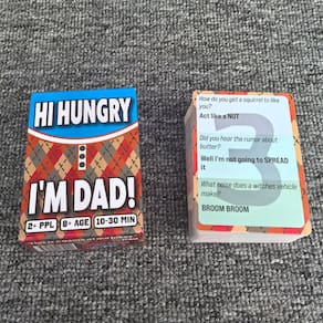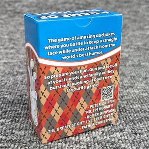 Material: papel Cor: azul Tamanho do pacote: 9 × 6,5 × 3,5 cm Peso do pacote: 0,18 kg Lista de embalagem: 1 x Conjunto de jogos de cartas de festa (50 cartas) Hilarious Dad Joke Card Game — Hi Hungry I'm Dad é um divertido jogo de cartas para festas repleto de humor clássico para pais e jogabilidade rápida que faz os jogadores rirem e competirem a cada rodada. Perfeito para noites de jogos em família — Projetado para crianças, adolescentes e adultos, este jogo é ideal para reuniões familiares, festas, feriados e noites de jogos casuais. Rápido e fácil de aprender — Regras simples facilitam o acesso rápido de novos jogadores, enquanto a jogabilidade rápida mantém todos engajados e entretidos. Ótimo para viagens e festas — O baralho de cartas compacto e a caixa portátil facilitam o transporte para viagens, salas de aula, festas ou férias em família. Entretenimento interativo em grupo — Incentiva a interação social, o riso e a competição amigável, tornando-o um ótimo quebra-gelo para grupos.